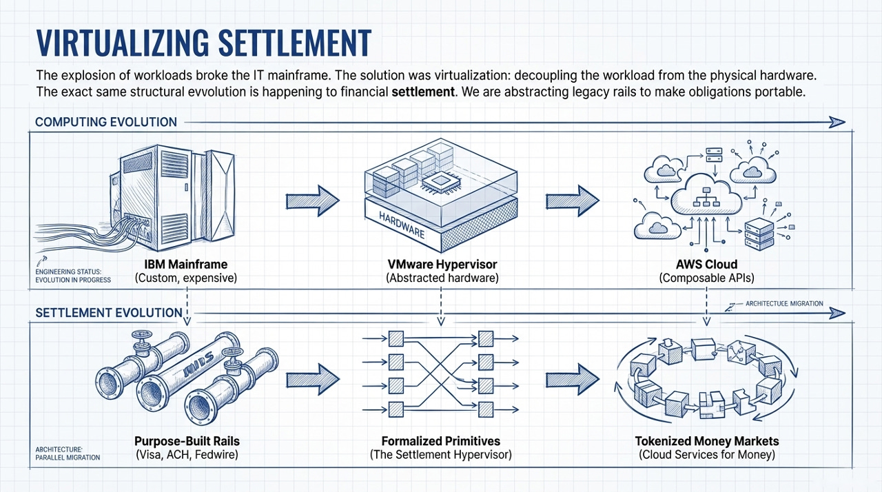 This concatenation, fragmentation, and globalization is the payment system’s equivalent of what happened to corporate IT in the early 2000s: the number and diversity of workloads exploded beyond what purpose-built mainframes could efficiently manage. The response in computing was virtualization, then cloud. The question is whether the same transformation is possible for settlement.