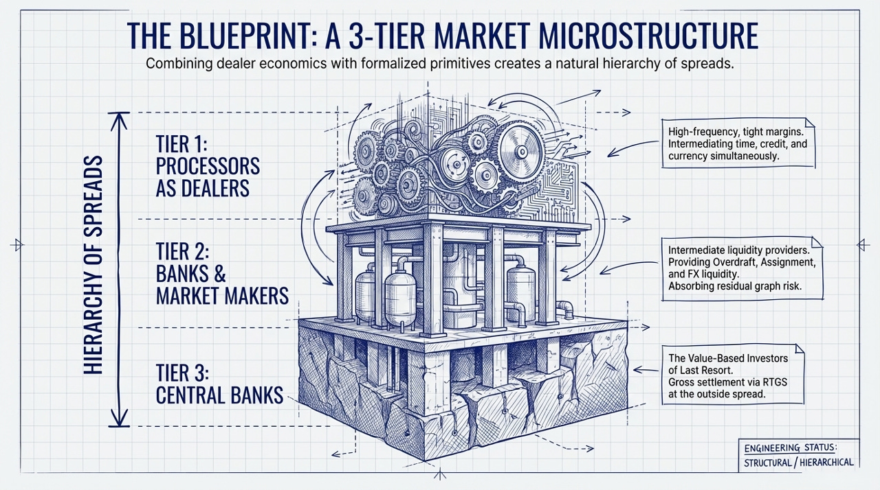 The three tiers form a natural hierarchy of spreads. Processors earn the tightest spread on the highest frequency. Banks and market makers earn a wider spread on lower frequency, higher capital-commitment intermediation. Central banks provide the ultimate backstop at the widest spread. Each tier’s economics are anchored by the tier below it, just as in Treynor’s original model the dealer’s inside spread is determined by the cost of laying off to the value-based investor.