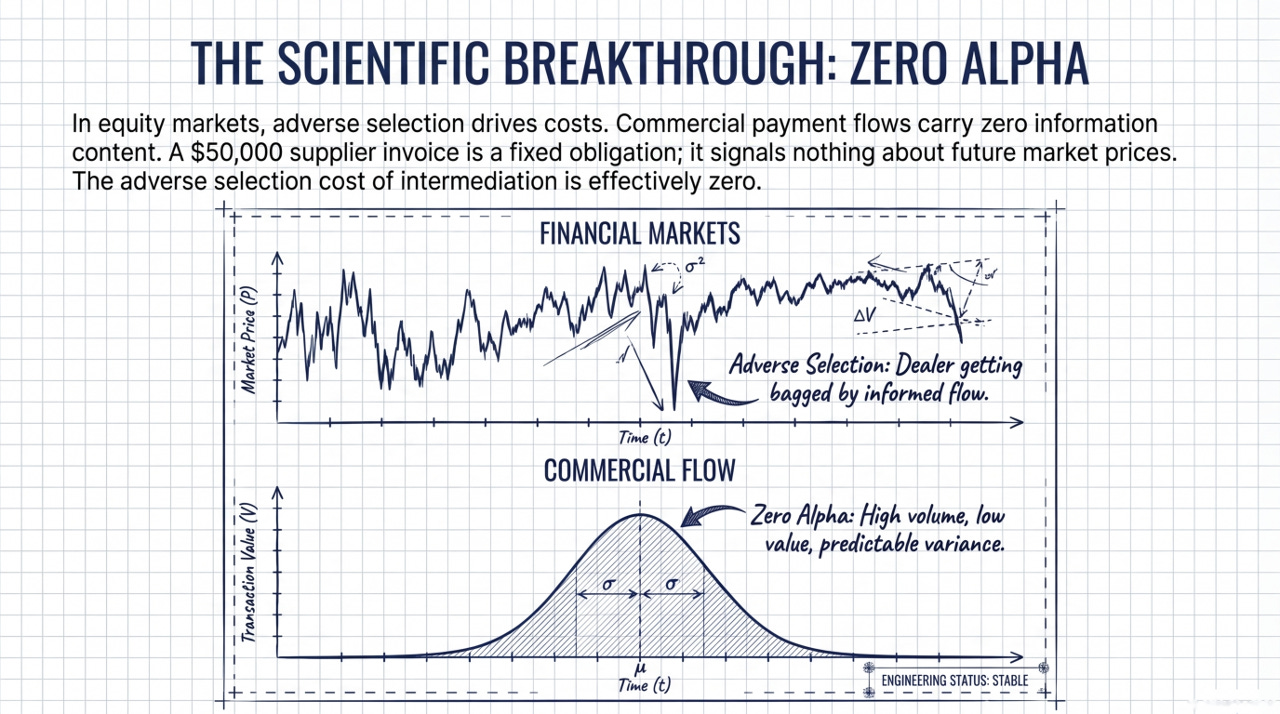 This is the Zero Alpha thesis: commercial payment flows carry no information content with respect to timing, making the adverse selection cost of intermediation effectively zero.