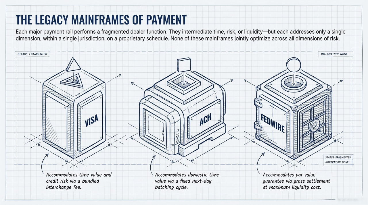 Consider the major payment rails through the lens of Treynor’s dealer model. Each one performs a dealer-like intermediation function — accommodating time-sensitive transactors, carrying inventory, earning a spread — but each addresses only one or two pricing dimensions, operates within a single jurisdiction, and runs on its own schedule.