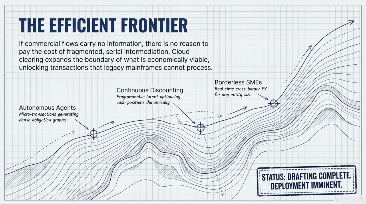 The hierarchy of dealer functions that Treynor identified in securities markets and Mehrling extended to money markets exists in payment settlement today — but fragmented across dozens of purpose-built systems, each optimizing a single dimension, none seeing the whole. Formalizing the primitives, tokenizing the instruments, and virtualizing the clearing function — applying financial compression not within isolated systems but across the full obligation graph — creates the conditions for these fragments to be composed into a unified market microstructure. Zero Alpha — the absence of information content in commercial flows — is what makes this composition possible. It is also what makes it necessary: if the flows carry no information, there is no reason to pay the cost of fragmented, serial, dimension-by-dimension intermediation. The efficient frontier is a single, continuously optimized, multidimensional clearing venue. Cloud clearing is the name for getting there.
