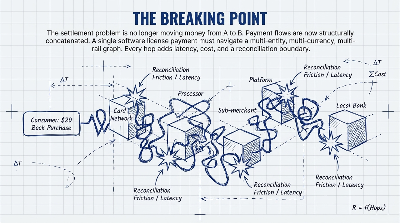 Payment flows have become concatenated: a single commercial transaction now passes through multiple intermediaries — card network, processor, platform, sub-merchant, bank — each adding latency, cost, and a reconciliation boundary. A $20 book purchase might traverse five separate systems before the author receives payment.