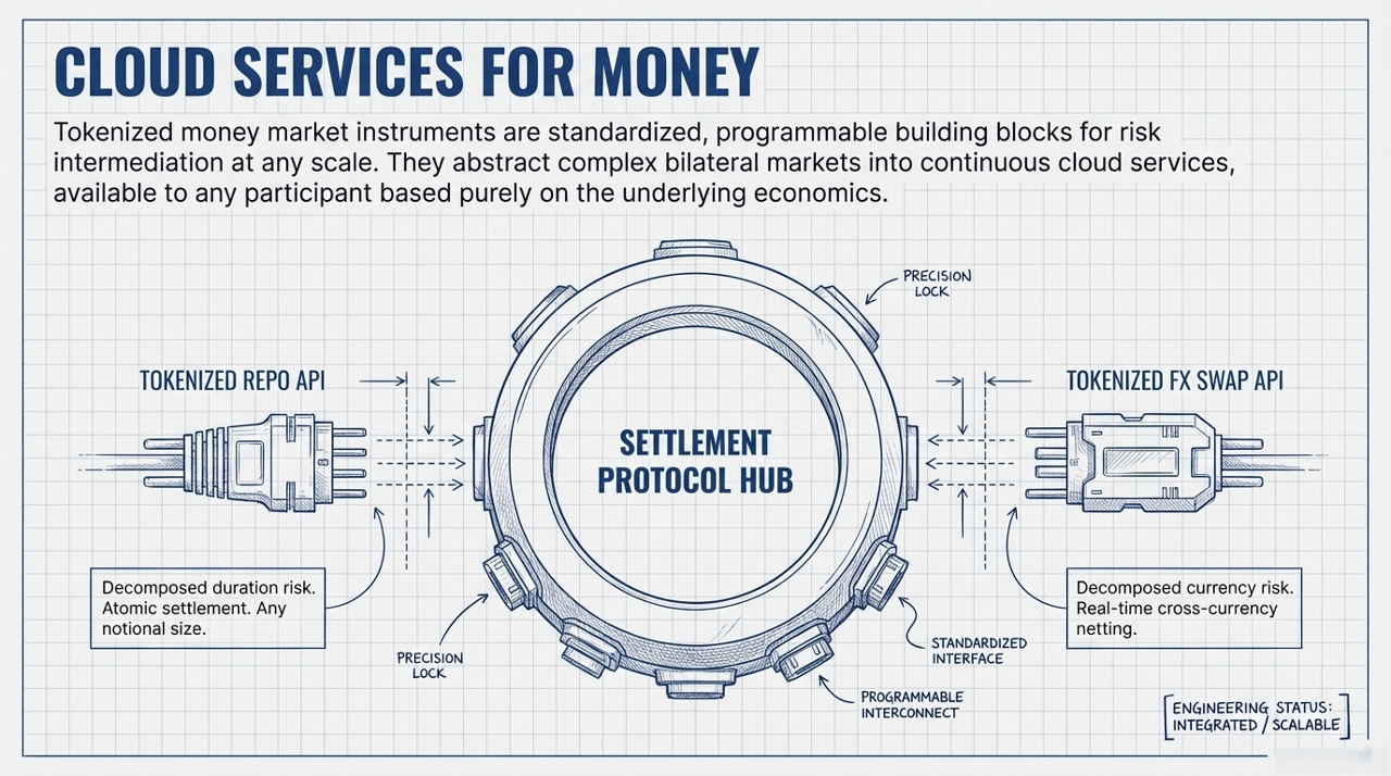A tokenized repurchase agreement is a standardized short-term lending instrument that can be executed at any notional size, settled atomically, and priced dynamically based on collateral quality and term. Today, repo is a bilateral interbank market with minimum ticket sizes in the hundreds of millions. Tokenized, it becomes a cloud service available to any participant at whatever size the economics support. A tokenized FX swap can be decomposed into spot and forward legs, priced against real-time cross-currency netting opportunities, and executed atomically across settlement domains — composable building blocks for cross-currency optimization at any scale. The same logic applies to tokenized overnight indexed swaps (pricing the time value of settlement acceleration), commercial paper, and certificates of deposit (providing short-duration credit intermediation for Tier 2 liquidity providers).
