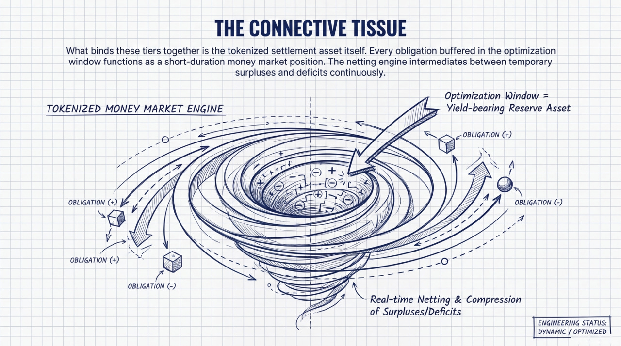 The tokenized money market as connective tissue. What binds these tiers together is the settlement asset itself: a programmable, tokenized instrument backed by regulated deposits and sovereign securities, operating continuously, and yielding a return on reserve assets. Every obligation buffered in the optimization window is, for the duration of that window, a short-duration money market position. The netting engine intermediates between parties with temporary surpluses and temporary deficits — which is exactly what money markets do, just expressed through settlement optimization rather than explicit lending. This is how tokenized money markets enter global commerce — not as a replacement for existing money markets, but as an emergent property of settlement optimization that makes money market economics available to any participant at any transaction size.