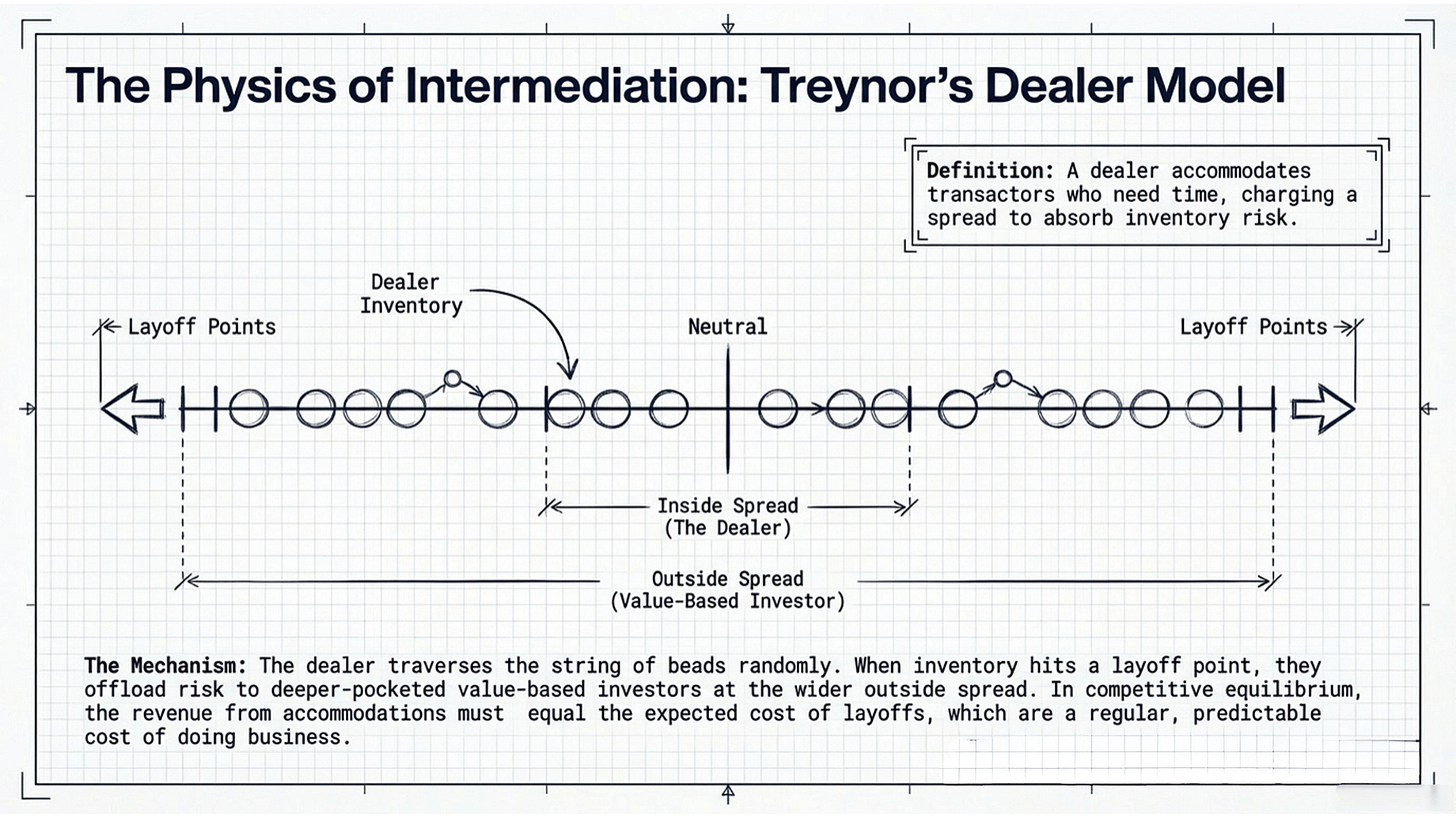 In 1987, Jack Treynor published a deceptively simple model of how financial markets actually work. The core idea: a dealer is someone who accommodates transactors to whom time is important, in exchange for charging buyers a higher price than he pays sellers. The dealer carries inventory — absorbing selling pressure by going long, absorbing buying pressure by going short — and earns the spread between his bid and ask for this service.