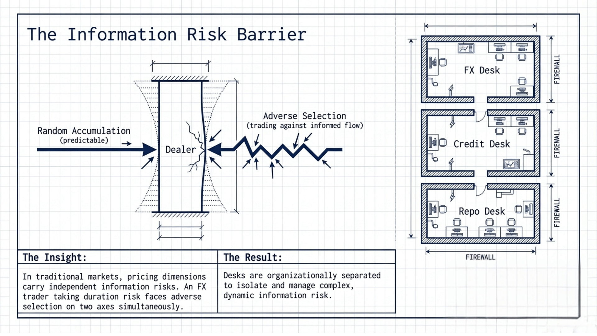 This separation is not a failure of imagination. It is a consequence of information asymmetry. In securities and money markets, each pricing dimension carries its own information risk. An FX trader who also takes duration risk is exposed to adverse selection on two axes simultaneously. The organizational separation of dealing desks is a risk management strategy: isolate each information risk to the desk best equipped to assess it.