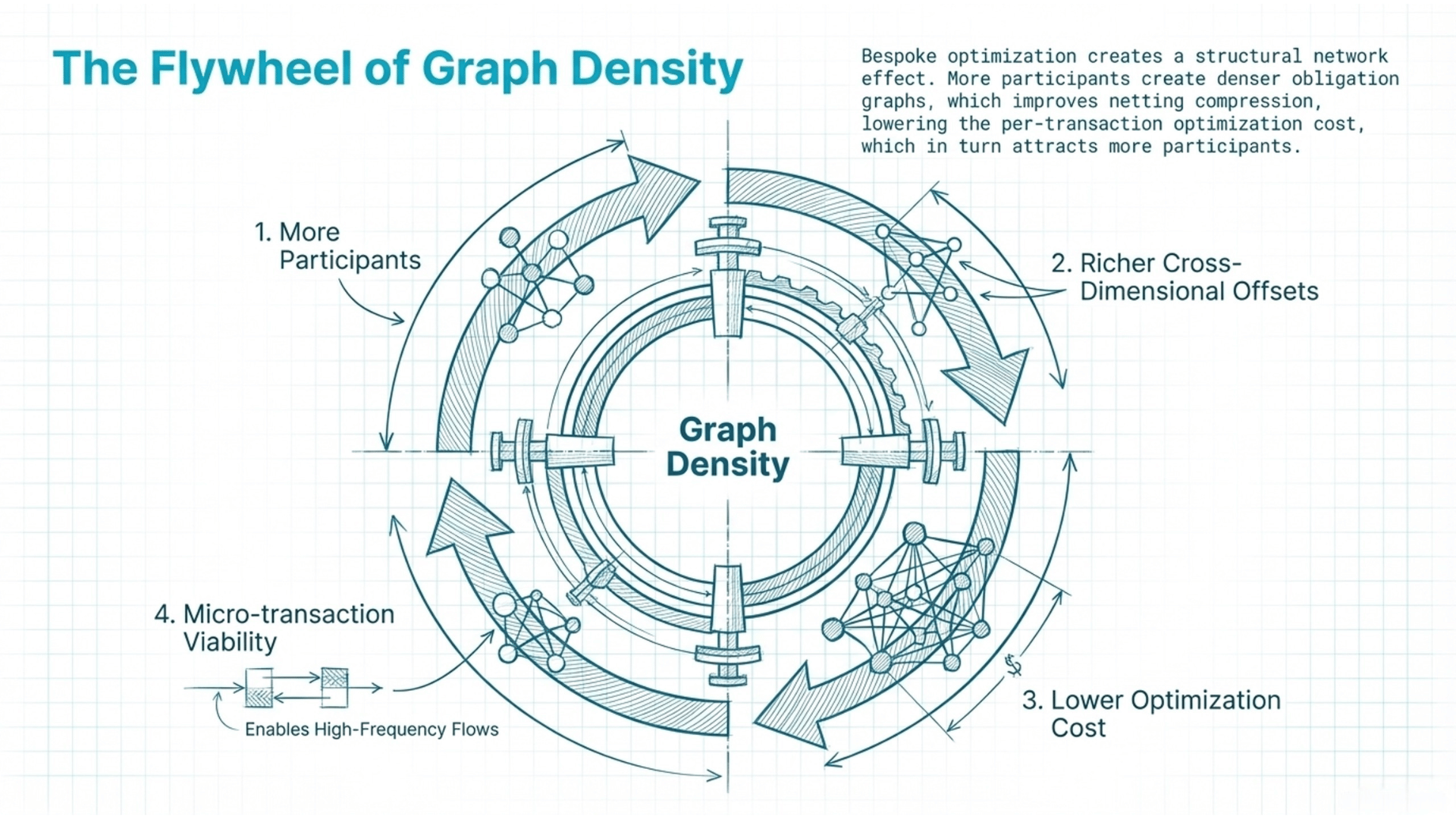 The adoption dynamic. The flywheel is self-reinforcing: each additional participant increases flow density, which improves netting compression, which reduces per-transaction cost, which attracts more participants. And because each obligation is optimized individually rather than batched generically, the system gets smarter as it gets bigger — more flow means more cross-dimensional offsetting opportunities, not just more volume through the same static pipes. The initial incentive to adopt is the concatenation, fragmentation, and globalization pain that processors and platforms already experience. The deeper incentive — tokenized money market intermediation, micro-transaction viability — unlocks as the network matures.