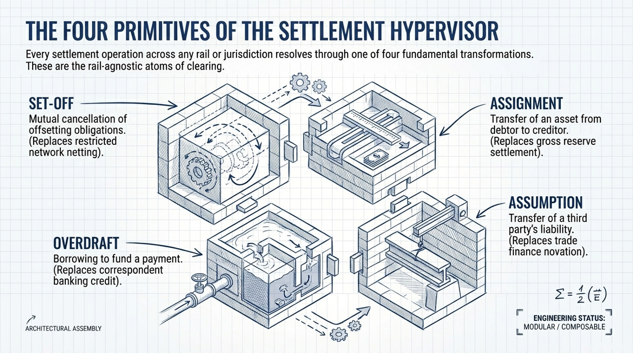 The equivalent for settlement is formalizing the operations that payment systems perform into standardized, composable primitives. Every settlement operation, regardless of rail or jurisdiction, resolves through one of four fundamental transformations: mutual cancellation of offsetting obligations (set-off), transfer of an asset from debtor to creditor (assignment), borrowing to fund a payment (overdraft), or transfer of a third party’s liability (assumption). These are the atoms of settlement, and they are rail-agnostic. Visa’s netting is set-off on a restricted graph. Fedwire settlement is assignment of central bank reserves. Correspondent banking credit is overdraft. Trade finance novation is assumption.