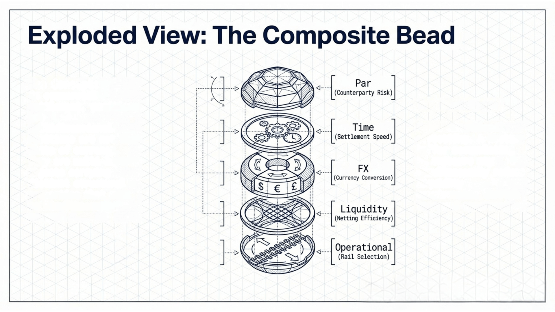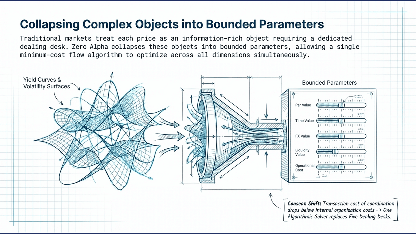 This is, in a formal sense, why composite beads are computationally and organizationally feasible for commercial settlement in a way they never could be for securities or money markets. The absence of information content doesn’t just eliminate adverse selection — it simplifies the pricing landscape from a set of objects requiring specialized management to a set of parameters amenable to joint optimization. The dealer in commercial settlement doesn’t need five desks. It needs one solver.