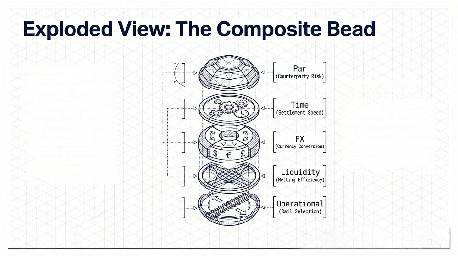 But the beads themselves are also different from those in securities or money markets. An obligation in a commercial payment graph has simultaneous exposure across multiple pricing dimensions: par value (counterparty risk), time value (settlement speed), FX value (currency conversion), liquidity value (netting efficiency), and operational cost (rail selection). In Treynor’s original model, the bead is a scalar — the dealer’s net position in a single security. In Mehrling’s money market extension, each pricing dimension has its own string of beads, managed by a separate desk. In a formalized settlement protocol, the beads are composite: multidimensional positions that can be jointly optimized.